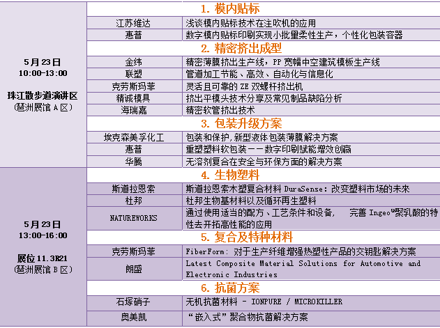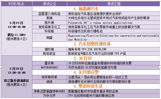 作為CHINAPLAS最重要的科技發(fā)布活動 – 科技講臺,將于5月21-23日在展會現(xiàn)場的“A區(qū)珠散演講區(qū)”和展館B區(qū)展位11.3R21兩個場地舉行。